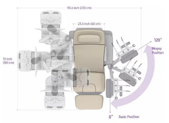 Hera i 10明顯區(qū)別于其他同類設(shè)備的亮點是安裝于顯示器右側(cè)的可調(diào)節(jié)座椅,最大尺寸長度為7.5英尺(230厘米)x寬6英尺(183厘米)x高度5.7英尺(175厘米)。座椅可通過機械控制,自動調(diào)整角度來配合醫(yī)生檢查和優(yōu)化患者就診體驗。