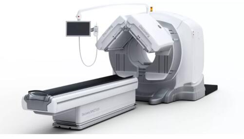 照片中的便是SPECT成像系統(tǒng),在患者診斷床的上方是SPECT成像系統(tǒng)的兩個(gè)探測(cè)器,它們重達(dá)660磅重,是可以沿著機(jī)架在患者上方旋轉(zhuǎn)的。