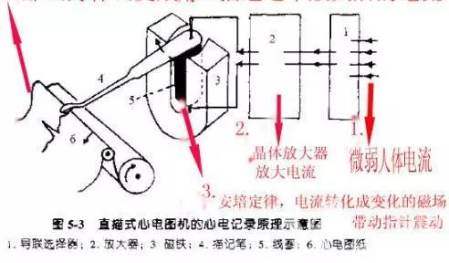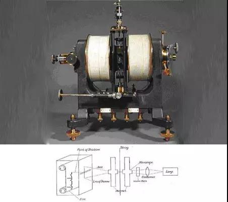 因?yàn)槊?xì)管靜電計(jì)的毛細(xì)血管不可能做的太細(xì),他無(wú)法測(cè)到更精確的電流,愛(ài)因托芬改進(jìn)了這個(gè)裝置,他利用通電的導(dǎo)體可以產(chǎn)生磁場(chǎng)的安培右手定律發(fā)明了----磁電式儀表。愛(ài)因托芬把提高靈敏度的任務(wù)完全交給超大的電磁鐵,而動(dòng)圈以匝數(shù)最少,質(zhì)量最輕為目標(biāo)。最終的結(jié)果是1895年推出的弦線式電流計(jì)---看清楚還不是心電圖機(jī)。