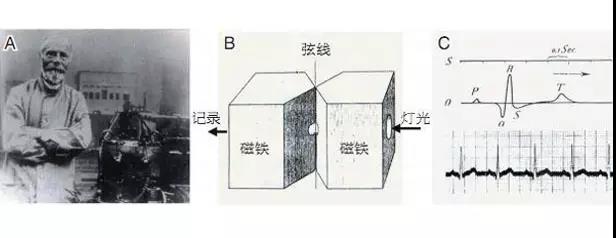 1903年,Einthoven成功地用弦線式心電圖機(jī)記錄了第一份真正意義上的心電圖,并將各波命名為P、Q、R、S、T、U波,這些命名沿用至今。這一年被稱(chēng)為心電圖的公元元年,愛(ài)因托芬因因此被稱(chēng)為心電圖之父。