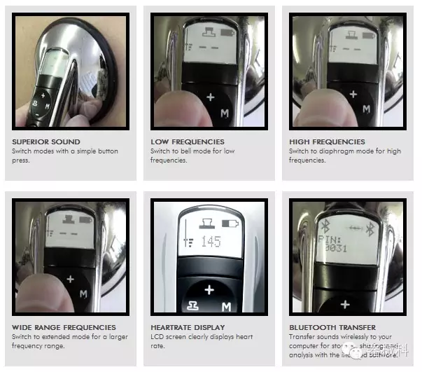 2009年,電子聽診器的發(fā)展達(dá)到了新的巔峰,Littmann®3200型電子聽診器(上圖)出現(xiàn)在世人面前。這是首個(gè)運(yùn)用藍(lán)牙技術(shù)的電子聽診器,它能夠?qū)⑿呐K、肺部和其他身體器官的信號(hào)無線傳送到醫(yī)師使用的電腦,并通過Cardioscan軟件實(shí)時(shí)地將聲音曲線顯示在電腦屏幕上,更準(zhǔn)確地揭示患者心臟可能存在的異?,F(xiàn)象。隨后,軟件會(huì)對(duì)聲波曲線進(jìn)行分析,并將代表有害雜音的異常部分的細(xì)節(jié)突出顯示出來。醫(yī)師能夠?qū)⒒胤潘俣冉档鸵话雭砀屑?xì)地分析問題,還能將文件保存到患者的檢查結(jié)果中,并通過電子郵件和Scope to Scope遠(yuǎn)程聽診軟件,將其發(fā)送給心臟病專家來確認(rèn)診斷結(jié)果。這套系統(tǒng)不僅能夠準(zhǔn)確捕捉到危險(xiǎn)的雜音,還能減少更為昂貴心電圖檢查費(fèi)用和不必要的心臟病專家的診療工作。從此傳統(tǒng)的電子聽診器變成了先進(jìn)的醫(yī)療工具,取代了醫(yī)師對(duì)心臟雜音的猜測(cè),提高了診斷能力。隨后3M公司推出了一系列改良產(chǎn)品......目前這方面3M公司的最新產(chǎn)品是Littmann4100系列(下圖)