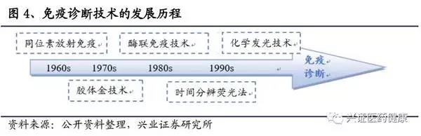 免疫診斷的發(fā)展需要依靠免疫學(xué)技術(shù)的不斷革新,免疫診斷的變革依次經(jīng)歷了放射免疫檢驗(yàn)(RIA)、膠體金快速檢驗(yàn)、酶聯(lián)免疫檢驗(yàn)(ELISA)、時(shí)間分辨熒光免疫(TRFIA)的迭代,最終迎來了化學(xué)發(fā)光免疫檢驗(yàn)(CLIA)的時(shí)代。