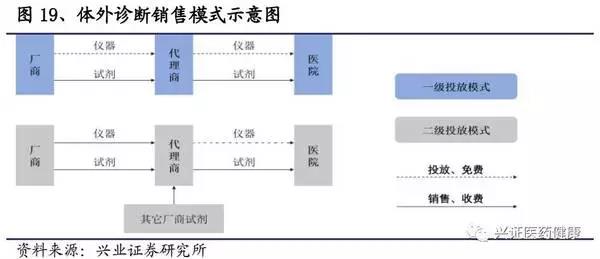 醫(yī)院是產(chǎn)業(yè)鏈上最強(qiáng)勢(shì)的一環(huán),國(guó)產(chǎn)產(chǎn)品對(duì)醫(yī)院的吸引力決定著國(guó)產(chǎn)替代進(jìn)程。在銷售模式上,公司多采用直銷和經(jīng)銷相結(jié)合,以經(jīng)銷為主。對(duì)于醫(yī)院終端,儀器基本以投放獲得,廠商以搭配銷售試劑的方式獲得收益。體外檢測(cè)等醫(yī)療服務(wù)由政府統(tǒng)一定價(jià),應(yīng)用化學(xué)發(fā)光法可相應(yīng)提高收費(fèi)標(biāo)準(zhǔn)(例如:福建省用化學(xué)發(fā)光法可加價(jià)80%)。因此,試劑屬于醫(yī)院的“成本項(xiàng)”,醫(yī)院有動(dòng)力對(duì)檢測(cè)方法進(jìn)行升級(jí)迭代,但卻并沒有動(dòng)力去特意抬高價(jià)格,在相同條件下會(huì)考慮試劑性價(jià)比,相對(duì)市場(chǎng)化。