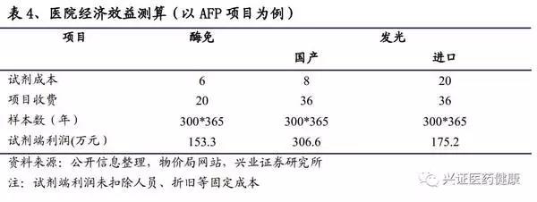 由于儀器是通過投放的形式進(jìn)駐醫(yī)院,從醫(yī)院端只需要計(jì)算試劑成本。以上測(cè)算可得出,此醫(yī)院若用發(fā)光替代酶免不僅進(jìn)行了檢驗(yàn)技術(shù)升級(jí),得到優(yōu)化的檢驗(yàn)結(jié)果,在經(jīng)濟(jì)效益上也更優(yōu)。在發(fā)光項(xiàng)目上,國(guó)產(chǎn)對(duì)比進(jìn)口經(jīng)濟(jì)效益明顯,單個(gè)項(xiàng)目可得到百來萬的額外收益。