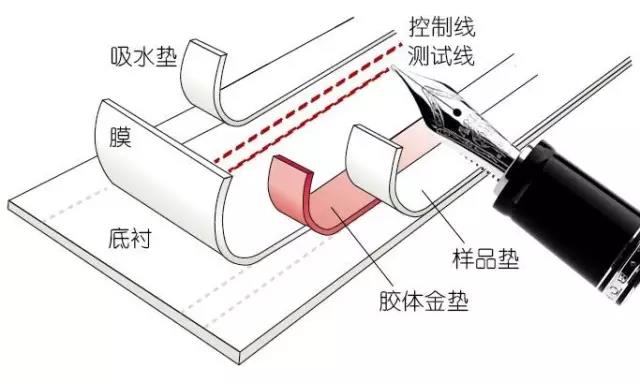 圖1所示的是膠體金免疫層析測試卡的結構,由樣品墊、膠體金結合墊、硝酸纖維素膜、吸水墊構成。其中,膠體金顆粒上修飾有檢測抗體,硝酸纖維素膜上有檢測線和控制線。檢測時,被測樣本在毛細作用下通過膠體金標記的抗體,形成抗原抗體膠體金復合物,復合物繼續(xù)爬行,通過包被有捕捉抗體的檢測線,形成雙抗體夾心膠體金復合物,在檢測線處呈現(xiàn)色帶。過量的膠體金抗體流過檢測線,在之后的控制線上形成膠體金免疫復合物,呈現(xiàn)色帶。需要注意的是,控制線上色帶的形成與被檢測物質的存在與否無關,即使樣本里沒有被檢測的物質,控制線也會顯現(xiàn)。這種“捕捉抗體-抗原-檢測抗體-膠體金納米顆粒標記物”復合結構被稱為雙抗體夾心結構,膠體金為指示標記。最典型的產(chǎn)品是“早早孕”試紙條,采用雙抗體夾心一步法技術,以膠體金為指示標記檢測尿液中的人絨毛膜促性腺激素(Human Choionic Gonadotophin,HCG)濃度,以判斷受檢者是否受孕。