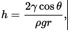 把一根細細的玻璃管的一端垂直放進一個水盤子里,水在玻璃管里面就會因毛細作用而上升,上升的高度可以由Jurin定律來計算[4]: