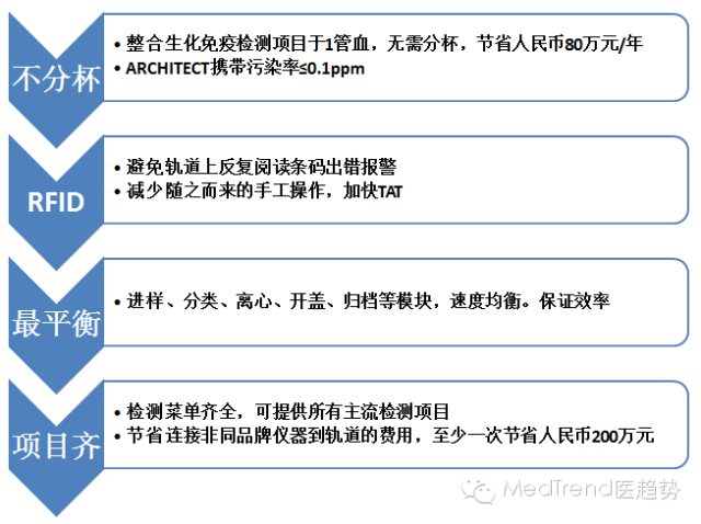 縱觀IVD國際品牌的發(fā)展歷程,都是從低速生化朝高速生化發(fā)展,由單機(jī)朝向集成化、自動化、流水線的方向發(fā)展。由于中國病人的過度集中于大型三級醫(yī)院,年收入超過10億的醫(yī)院每天樣本量超過1000個(gè),高速儀器是高端醫(yī)院的剛需,因此研發(fā)高速儀器的能力也是未來進(jìn)入大型公立醫(yī)院的前提要求,流水線、生化免疫聯(lián)機(jī)是大勢所趨。