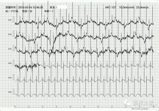 3、關(guān)于抗干擾能力,對(duì)于只有兩個(gè)電極沒有地線的情況下,對(duì)這個(gè)機(jī)器的要求真的不能太高?;€干擾和不穩(wěn)定是經(jīng)常的,所以需要測(cè)試人配合安靜勿動(dòng)。測(cè)試1描測(cè)的心電圖除了只有一個(gè)導(dǎo)聯(lián)的限制之外,基本可以滿足各項(xiàng)心電圖數(shù)據(jù)的測(cè)量。測(cè)試2和3都是處于深度鎮(zhèn)靜氣管插管的小兒,出現(xiàn)兩個(gè)問題:1.小兒腹軟且腹部動(dòng)度較大導(dǎo)致呼吸波干擾明顯,所以建議把左下腹電極片貼到左髂部或左股部外側(cè);2.基線干擾更加明顯,這時(shí)本人手握患兒左下肢后基線干擾消失,對(duì)心電記錄波形沒有產(chǎn)生明顯影響。