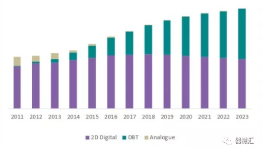 在過(guò)去的兩年中,DBT的應(yīng)用使乳腺X線攝影市場(chǎng)經(jīng)歷了快速增長(zhǎng)。在早幾年前引入報(bào)銷制度后,這一趨勢(shì)在美國(guó)尤為明顯,2017年達(dá)到頂峰。