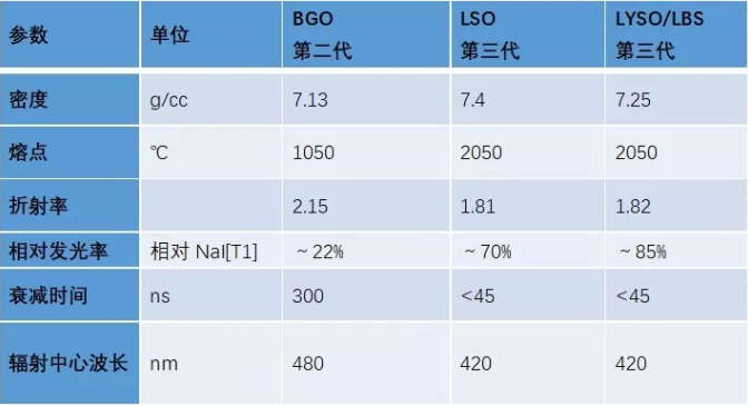(1)晶體:從理論上講,表1所列幾種晶體均可以用于PET探測(cè)器,但是從臨床經(jīng)驗(yàn)來(lái)看,目前用于PET探測(cè)器的晶體主要有BGO、LYSO、LSO和LBS等四種。其中LYSO、LSO以及LBS這類晶體由于含有金屬镥(Lutetium),因此余輝時(shí)間明顯減少。一般認(rèn)為晶體余輝時(shí)間小于80ns(納秒)就可以實(shí)現(xiàn)飛行時(shí)間(Time of Flight, TOF)技術(shù)。而BGO等晶體余輝時(shí)間太長(zhǎng),不能實(shí)現(xiàn)TOF技術(shù),即將淘汰(1,2)。當(dāng)然,含镥晶體(LSO、LYSO)也有其不足,就是含有自身本底放射性,有效原子序數(shù)偏小,會(huì)導(dǎo)致射線探測(cè)效率降低。所以,一般講LYSO、LSO和LBS這類晶體在PET探測(cè)器中其最佳長(zhǎng)度為20mm左右(3)。所以,如果選擇LYSO、LSO或LBS這一類晶體,那么就必須具有TOF技術(shù)來(lái)彌補(bǔ)或克服其探測(cè)效率低的固有缺陷。