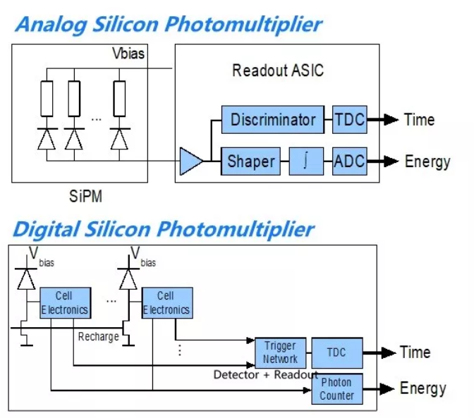 SiPM較傳統(tǒng)的PMT而言,采用了半導(dǎo)體集成電路芯片技術(shù)。這種半數(shù)字化芯片產(chǎn)品,體積明顯減小,可以做到高度的集成化,同時(shí)可以實(shí)現(xiàn)PET中關(guān)鍵的TOF技術(shù)。但是,模擬信號(hào)到數(shù)字信號(hào)的A/D轉(zhuǎn)換依然需要后續(xù)ASIC電路來(lái)解決,SiPM只是和原來(lái)的PMT一樣,單純的進(jìn)行信號(hào)的接受放大,其采集到的電信號(hào)通過(guò)后續(xù)的電路去估算大致的光子計(jì)數(shù),并轉(zhuǎn)化成數(shù)字信號(hào),一個(gè)輸出=所有脈沖的疊加,處理過(guò)程依然受到模擬電路的影響(3,7)。
