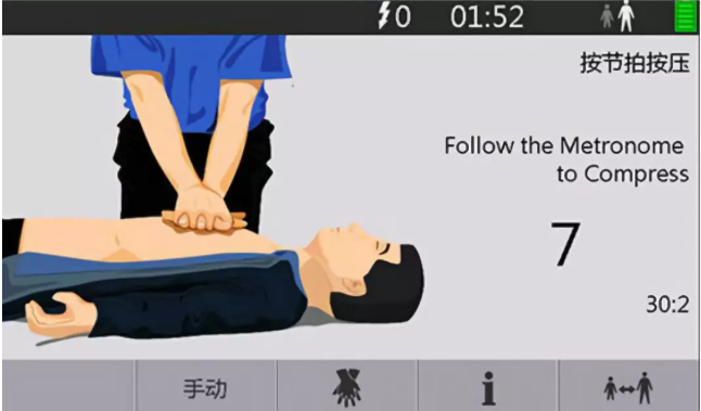 1. 開啟AED,打開AED的蓋子,依據(jù)視覺和聲音的提示操作(有些型號需要先按下電源)。2. 給患者貼電極,在患者胸部適當(dāng)?shù)奈恢蒙?,緊密地貼上電極(通常而言,兩塊電極板分別貼在右胸上部和左胸左乳頭外側(cè),具體位置可以參考AED機(jī)殼上的圖樣和電極板上的圖片說明)。3. 將電極板插頭插入AED主機(jī)插孔。4. 開始分析心律,在必要時(shí)除顫,按下“分析”鍵(有些型號在插入電極板后會(huì)發(fā)出語音提示,并自動(dòng)開始分析心率,在此過程中請不要接觸患者,即使是輕微的觸動(dòng)都有可能影響AED的分析),AED將會(huì)開始分析心率。分析完畢后,AED將會(huì)發(fā)出是否進(jìn)行除顫的建議,當(dāng)有除顫指征時(shí),不要與患者接觸,同時(shí)告訴附近的其他任何人遠(yuǎn)離患者,由操作者按下“放電”鍵除顫。5. 一次除顫后未恢復(fù)有效灌注心律,進(jìn)行5個(gè)周期CPR(心肺復(fù)蘇術(shù))。除顫結(jié)束后,AED會(huì)再次分析心律,如未恢復(fù)有效灌注心律,操作者應(yīng)進(jìn)行5個(gè)周期CPR,然后再次分析心律,除顫,CPR,反復(fù)至急救人員到來。