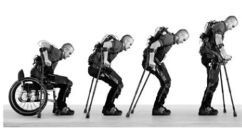 2010年,伯克利仿生研究所研制出的一種由電池提供動力的機械骨骼系統(tǒng)“eLEGS“。這是世界上第一款不使用繩或鏈達(dá)到自然行走目標(biāo)的外骨骼,使用者通過手臂姿勢控制,向前移動右拐杖,則左腿隨之向前移動,幫助截癱患者擺脫輪椅以自然步態(tài)行走。