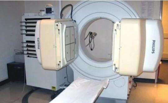 照片中的便是SPECT成像系統(tǒng),在患者診斷床的上方是SPECT成像系統(tǒng)的兩個(gè)探測(cè)器,它們重達(dá)660磅重,是可以沿著機(jī)架在患者上方旋轉(zhuǎn)的。