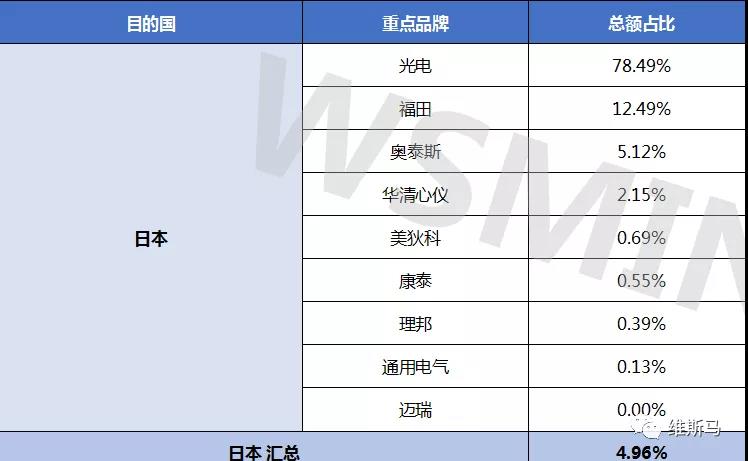 日本市場為中國心電圖出口第五大市場,共計(jì)9家出口商,占全年心電圖出口4.96%的份額。其中光電在日本市場占有率高達(dá)78.49%。