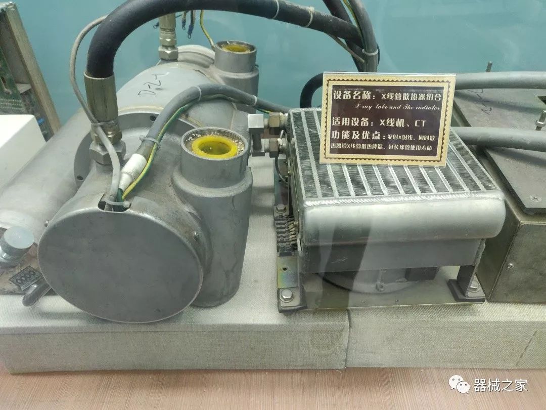 由于X線機(jī)產(chǎn)生X射線的過程中只有百分之一的動能轉(zhuǎn)化為X射線,其余的能量都以熱能的形式散失。這就需要良好的散熱設(shè)備,也就是這個散熱器。散熱器大多采用油冷。變壓器油不僅絕緣,而且能夠吸收散亂射線,防止擊穿。使用時,一般會用油泵將冷油泵入到球管周圍,將熱油從另一管導(dǎo)出,在冷卻板上冷卻,循環(huán)利用。