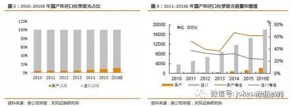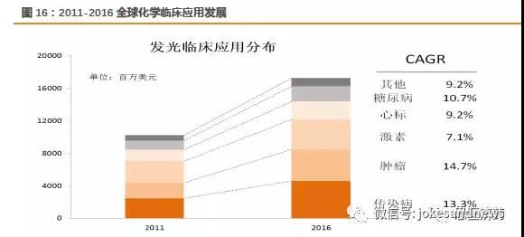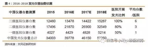 2016年化學(xué)發(fā)光市場容量接近200億,國產(chǎn)占比不到20億,但是只考慮總的市場容量是不合理的,因為以目前國產(chǎn)水平難以和進(jìn)口競爭,所以我們分析市場有效空間。