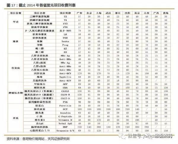 中國各個省的收費標(biāo)準(zhǔn)差異較大,北京是以進(jìn)口和國產(chǎn)來區(qū)分,有些地方是按照醫(yī)院級別來區(qū)分價格,江浙幾乎不區(qū)分方法學(xué),大部分區(qū)域是分方法學(xué)收費,如下圖所示。最大收費標(biāo)準(zhǔn)差異有接近10倍差異,但整體趨勢是類似的。即腫瘤相對價格高,傳染病價格相對較低,甲功和激素位于中位,另外一些不太普及的項目,比如骨代謝、維生素等等,價格起伏較大。