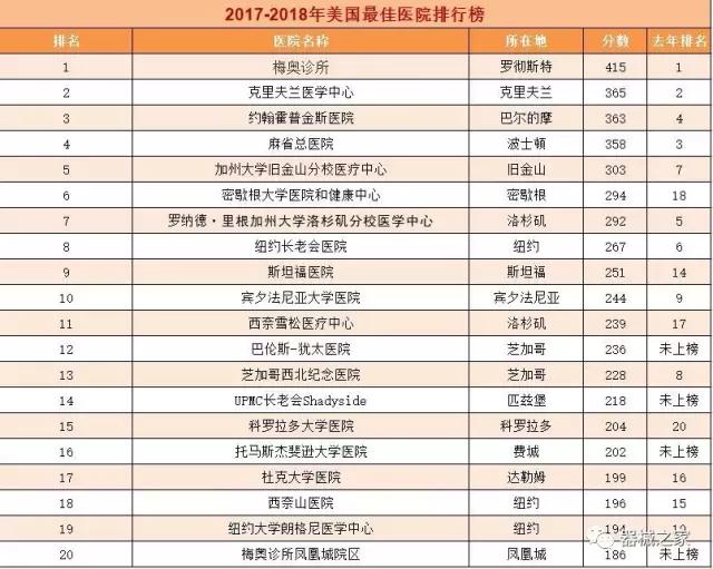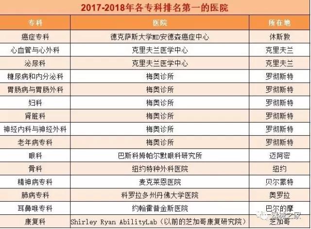 在醫(yī)療界梅奧診所就是傳說(shuō)中的麥加,世界頂尖的醫(yī)療機(jī)構(gòu)。2017年8月8日,《美國(guó)新聞與世界報(bào)道》公布了2017-2018美國(guó)最佳醫(yī)院排行榜,梅奧診所以415分的總分再次榮登榜首,并在糖尿病和內(nèi)分泌???、胃腸科、婦科、腎臟科、神經(jīng)專科和老年病學(xué)六個(gè)??浦信琶谝?。