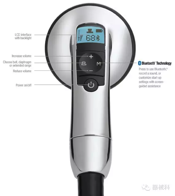 2009年,電子聽診器的發(fā)展達(dá)到了新的巔峰,Littmann®3200型電子聽診器(上圖)出現(xiàn)在世人面前。這是首個(gè)運(yùn)用藍(lán)牙技術(shù)的電子聽診器,它能夠?qū)⑿呐K、肺部和其他身體器官的信號(hào)無線傳送到醫(yī)師使用的電腦,并通過Cardioscan軟件實(shí)時(shí)地將聲音曲線顯示在電腦屏幕上,更準(zhǔn)確地揭示患者心臟可能存在的異?,F(xiàn)象。隨后,軟件會(huì)對(duì)聲波曲線進(jìn)行分析,并將代表有害雜音的異常部分的細(xì)節(jié)突出顯示出來。醫(yī)師能夠?qū)⒒胤潘俣冉档鸵话雭砀屑?xì)地分析問題,還能將文件保存到患者的檢查結(jié)果中,并通過電子郵件和Scope to Scope遠(yuǎn)程聽診軟件,將其發(fā)送給心臟病專家來確認(rèn)診斷結(jié)果。這套系統(tǒng)不僅能夠準(zhǔn)確捕捉到危險(xiǎn)的雜音,還能減少更為昂貴心電圖檢查費(fèi)用和不必要的心臟病專家的診療工作。從此傳統(tǒng)的電子聽診器變成了先進(jìn)的醫(yī)療工具,取代了醫(yī)師對(duì)心臟雜音的猜測(cè),提高了診斷能力。隨后3M公司推出了一系列改良產(chǎn)品......目前這方面3M公司的最新產(chǎn)品是Littmann4100系列(下圖)