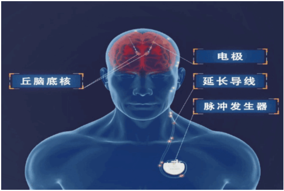 腦起搏器是腦深部電刺激療法(DBS)的俗稱,這種直接作用于神經(jīng)中樞的人工裝置,通過埋植于胸前的脈沖發(fā)生器向植入在大腦特定靶點(diǎn)的電極發(fā)放弱電脈沖,刺激腦內(nèi)控制運(yùn)動的相關(guān)神經(jīng)核團(tuán),抑制引起帕金森病癥狀的異常腦神經(jīng)信號。從而消除因帕金森病導(dǎo)致的運(yùn)動失能,并減輕服用藥物產(chǎn)生的運(yùn)動癥狀波動和異動,成為藥物“蜜月期”結(jié)束后首選的治療方法。