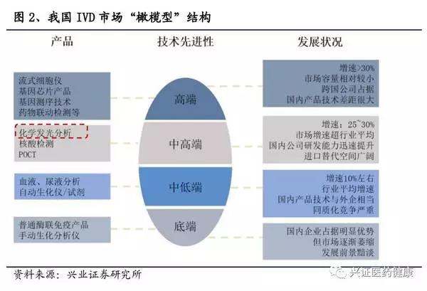 產(chǎn)品結(jié)構(gòu)上,我國(guó)體外診斷行業(yè)總體呈現(xiàn)“橄欖型”結(jié)構(gòu):低端市場(chǎng)是前期廣泛使用的檢驗(yàn)技術(shù),發(fā)展空間小,增速緩慢,正在進(jìn)行方法學(xué)上的更新和迭代;中端市場(chǎng)由于近幾年國(guó)產(chǎn)研發(fā)能力迅速提升,渠道優(yōu)勢(shì)明顯,國(guó)內(nèi)產(chǎn)品正在處在高速發(fā)展階段;高端市場(chǎng)由于技術(shù)壁壘高,國(guó)內(nèi)外差異大,主要為國(guó)外產(chǎn)品,國(guó)內(nèi)產(chǎn)品目前在研發(fā)潛伏期,未來將迎來增長(zhǎng)。