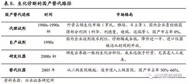 現(xiàn)今,化學(xué)發(fā)光的發(fā)展階段與2000年左右的生化市場(chǎng)相似,回顧生化市場(chǎng)的國(guó)產(chǎn)替代進(jìn)程,可有一定的啟示作用。生化的發(fā)展首先從代理國(guó)外廠家的試劑開始,逐步自主研發(fā)試劑,此時(shí)促使國(guó)外廠家對(duì)其生化系統(tǒng)進(jìn)行開放。而后逐步研發(fā)出生化儀器,對(duì)整個(gè)生化診斷進(jìn)行替代。進(jìn)程如下:
