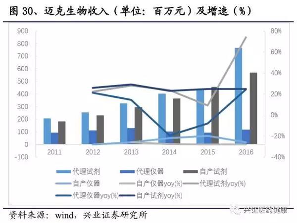 產(chǎn)品線布局全面,放量開啟。邁克早期產(chǎn)品主要是生化試劑,通過代理和自產(chǎn),公司不斷豐富產(chǎn)品線。從產(chǎn)品布局來看,公司與海外龍頭羅氏、雅培類似,采取全覆蓋戰(zhàn)略。隨著行業(yè)的發(fā)展,終端對(duì)于產(chǎn)品的需求從單產(chǎn)品轉(zhuǎn)為整體解決方案,產(chǎn)品線延長(zhǎng),保障了未來的增速。短期內(nèi),邁克發(fā)光的快速增長(zhǎng)可以有效帶動(dòng)收入與利潤(rùn)的增長(zhǎng),其他細(xì)分產(chǎn)品線在2017年以后也即將放量。