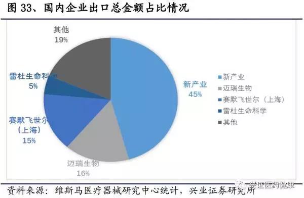 渠道能力強(qiáng),國(guó)內(nèi)外銷售情況表現(xiàn)不俗。新產(chǎn)業(yè)采用經(jīng)銷為主,直銷為輔的模式進(jìn)行銷售。在國(guó)內(nèi)市場(chǎng),新產(chǎn)業(yè)終端用戶分布范圍廣,省份分散,覆蓋醫(yī)院3000多家。其中,二級(jí)醫(yī)院有1千多家,三級(jí)醫(yī)院近1千家,一級(jí)醫(yī)院較少。今后,一級(jí)醫(yī)院市場(chǎng)將被充分開發(fā),將通過自購(gòu)或者區(qū)域檢驗(yàn)中心的方式,將免疫檢測(cè)技術(shù)更新至化學(xué)發(fā)光法,市場(chǎng)空間巨大。在出口方面,儀器出口收入占到總收入近一半,試劑出口收入占到10%左右。2016年出口總額為國(guó)內(nèi)第一,占到總金額的45.6%。