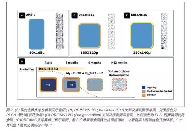 鎂是人體的必需元素,具有多種生理功能,與生命的維持、身體的健康有著極其密切的關系,因此可降解冠脈鎂合金支架研發(fā)處于可降解金屬支架的領先水平,以德國Biotronik 公司的鎂合金支架為代表, 前后經歷了AMS、DREAMS 1G(drug-eluting absorbable metal scaffold 1 generation)和DREAMS 2G(drug-eluting absorbable metalscaffold 2 generation)三代支架(圖2),支架基體采用WE43 鎂合金材料[21]。AMS 為鎂合金裸支架,經過PROGRESS 臨床實驗顯示支架具有良好的安全性,且在新生兒體內植入兩個AMS支架后,新生兒血清鎂含量處于正常水平,且不需要進行二次手術,但是降解速度太快徑向支撐力不足導致晚期管腔丟失現象嚴重,因此在該基礎上對鎂合金裸支架的成分和構型進行了更新,加粗了骨架尺寸,添加了一層載有紫杉醇藥物的可降解PLGA 高分子涂層,從而增強了支架支撐力,減少內膜增生以及降低降解速率,研發(fā)出了DREAMS 1G[22-24]。