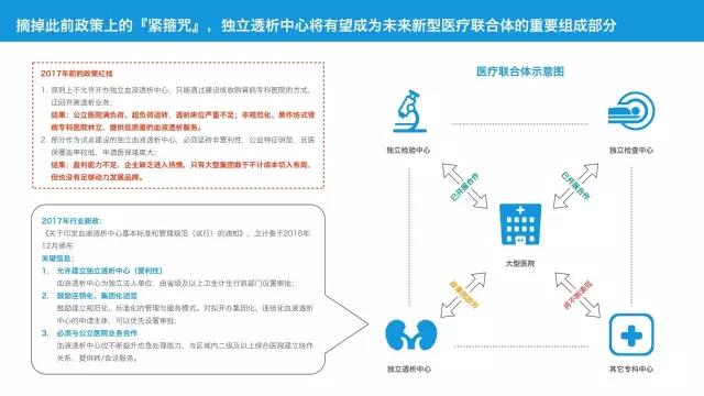 17年新政實(shí)施后,獨(dú)立血液透析中心將有望同第三方獨(dú)立檢驗(yàn)中心、檢查中心一道,成為新型醫(yī)療聯(lián)合體的組成部分。